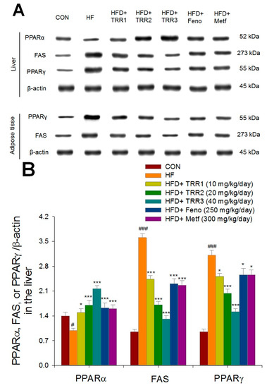 High-fat diet-fed mice reduced hepatic PPARα expressions, but increased in FAS and PPARγ expressions as compared with the CON mice (Figure 7A). The TRR1-, TRR2-, TRR3-, Feno-, or Metf-treated mice show an increase in the expression levels of PPARα, but a decrease in expressions of FAS in the liver; and TRR1-, TRR2-, or TRR3-treated mice reduced the expression levels of PPARγ as compared with the HF mice (Figure 7A,B). Expression of PPARγ and FAS in adipose tissue increased in the HF group. The TRR2-, TRR3-, Feno-, or Metf-treated mice decreased expression levels of PPARγ and FAS in adipose tissue (Figure 7A,C).
