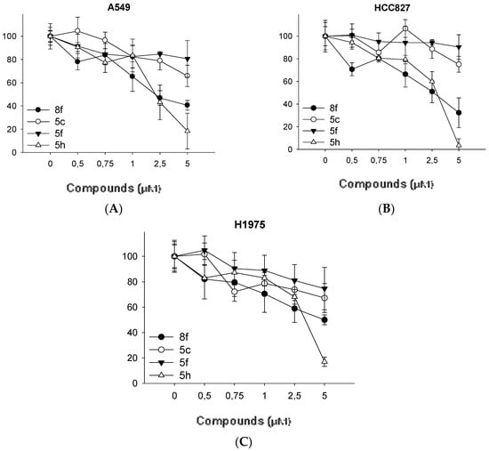 Compound 8f was obtained following the procedure described for 5a, starting from 7 and 1-ethynylcyclohexanol. Yield: 83%; mp 154–155 °C. 1H-NMR δ = 10.33 (s, 1H, –NH), 7.86 (s, 1H), 7.46 (d, J = 8.2 Hz, 2H), 7.12 (d, J = 8.2 Hz, 2H), 5.23 (s, 2H), 4.86 (s, 1H, –OH), 2.51 (t, 2H, J = 7.8 Hz, J = 6.3 Hz), 1.85–1.64 (mm, 6H), 1.51 (m, 2H), 1.41 (m, 4H), 1.24 (bs, 10 H), 0.83 (t, 3H, J = 6.3 Hz, J = 7.0 Hz). 13C-NMR δ = 164.51, 156.08, 138.19, 136.57, 129.04, 122.97, 119.65, 68.44, 52.55, 38.29, 34.98, 31.70, 31.41, 29.26, 29.10, 29.04, 25.70, 22.52, 22.09, 14.39. ESI-MS calculated: 412.57; Found: 413.3 [M + H]+. Anal. (C24H36N4O2), C, H, N.