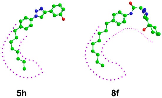 Compound 8c was obtained following the procedure described for 5a, starting from 7 and 4-pentyn-1-ol. Yield: 82%; mp 171–172 °C. 1H-NMR δ = 10.30 (s, 1H, –NH), 7.81 (s, 1H), 7.43 (d, J = 7.0 Hz, 2H), 7.10 (d, J = 7.0 Hz, 2H), 5.19 (s, 2H), 4.44 (s, 1H, –OH), 3.40 (m, 2H), 2.62 (t, 2H, J = 7.4 Hz, J = 7.8 Hz), 1.71 (t, 2H, J = 7.4 Hz, J = 7.8 Hz), 1.49 (m, 2H), 1.21 (bs, 10 H), 0.81 (t, 3H, J = 6.3 Hz, J = 7.0 Hz). 13C-NMR δ = 164.53, 146.99, 138.19, 136.54, 129.03, 123.88, 119.67, 60.49, 52.50, 34.98, 32.74, 31.70, 31.40, 29.26, 29.10, 29.04, 22.51, 22.07, 14.39. ESI-MS calculated: 372.50; Found: 373.3 [M + H]+. Anal. (C21H32N4O2), C, H, N.