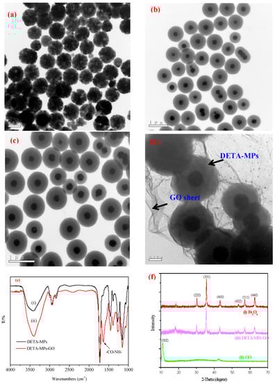 Transmission electron microscopy (TEM) images of: (a) magnetic Fe3O4 microspheres; (b) magnetic core-shell polymer (Fe3O4@poly(GMA-co-DVB)); (c) DETA-MPs; (d) DETA-MPs-GO; (e) Fourier-transformed infrared spectroscopy (FTIR); and (f) X-ray diffraction (XRD) spectra of synthesized materials. EDTA-MPs: diethylenetriamine-functional magnetic core-shell polymer, GO: graphene oxide.