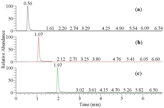 Furthermore, we selected several UPLC columns (C8, C18, Waters High Strength Silica (HSS) T3) to optimize the chromatographic retention of the nine target fungicides. Carbendazim, which was the most polar among the nine fungicides, was selected as the representative fungicide. As shown in Figure 2 carbendazim showed poor retention on the C18 column (t = 0.56 min, Figure 2a) because the structure of carbendazim was strongly polar. Better retention was obtained on the C8 column at 1.07 min (Figure 2b). However, satisfactory retention could be observed when using the Waters HSS T3 column (t = 1.97 min, Figure 2c), which can analyze polar structures. Therefore, Waters HSS T3 was selected as the separation column for the analysis of the nine fungicides. The typical selected ion monitoring (SIM) chromatogram of the nine target fungicides was shown in Figure 3, and it could be observed that their peaks were symmetrical and well separated.