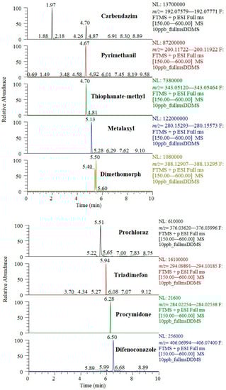 Fungicides are among the most extensively exploited pesticides to destroy or prevent the growth of many plant pathogenic fungi in modern agriculture. Generally, due to their curative, protective, and eradicant functions, which are resistant to a large variety of crop fungal diseases [,], carbendazim, thiophanate-methyl, pyrimethanil, metalaxyl, prochloraz, procymidone, dimethomorph, triadimefon, and difenoconazole are widely applied in the cultivation of fruit, vegetables, and other crops. However, commonly used fungicides are highly toxic, and many of them have been proved to enervate the liver function, change the urinary bladder structure, and decrease kidney weight []. Considering their significant toxicity and potential mutagenicity, fungicides have received lots of attention all over the world []. Therefore, it is very important to develop an accurate and sensitive detection methodology for the simultaneous measurement of commonly used fungicides in fruits samples.