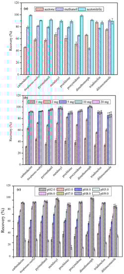 The selection of the extraction solvent was the most important step for sample preparation. It usually affected the qualitative and quantitative results of target analytes. Based on the “like dissolves like” principle, acetone, methanol, and acetonitrile were chosen as extraction solvents. The impact of the extract solvent on the extraction efficiency was studied by spiking nine fungicides in blank fruit samples (apple was selected as an example) at 5.0 μg/kg. The extraction recoveries for these extract solvents were determined, and the results shown in Figure 4a indicated that poor extraction recoveries were obtained by applying methanol or acetone as the extraction solvent for most of the nine fungicides, while acetonitrile gave excellent efficiencies. The possible reason was that the polarity of acetonitrile is closer to that of the nine studied fungicides than to that of acetone and methanol. Therefore, acetonitrile was selected as the extraction solvent in this study. Subsequently, the MSPE procedure with DETA-MPs-GO as an adsorbent was processed for the following purification.