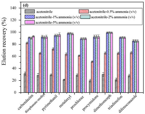 For the MSPE method, it was crucial to choose an effective desorption solvent for target compounds. Hence, in this study, the elution of nine fungicides was investigated carefully using several types of elution solvents, including pure acetonitrile and a series of acetonitrile solutions containing different proportions of ammonium hydroxide (v/v). The obtained results in Figure 4d indicated that pure acetonitrile was not very suitable for the desorption of nine fungicides, owing to the terrible desorption efficiency of the target fungicides (19.8% to 31.5%). It could be concluded that some other interactions took place, except a π–π interaction between fungicides and DETA-MPs-GO. The amino groups of DETA-MPs-GO were able to form stronger interactions with fungicides, for instance, hydrogen bonds. As shown in Figure 4d, alkaline acetonitrile performed better desorption recoveries than pure acetonitrile. This is because the hydrogen bond was easy to destroy under alkaline conditions. Considering the cost and convenience, acetonitrile containing 1% ammonium hydroxide showed the highest recovery; therefore it was chosen as the desorption solvent in subsequent tests.