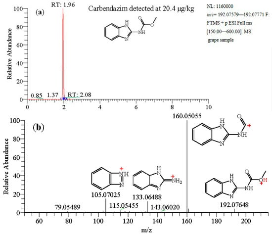 The developed method was applied for the detection of fungicides in fruit samples bought from several supermarkets in China. A total of 81 fruit samples, including six types (grape, apple, pear, orange, yangtao, and watermelon), were detected, while 96.3% of them presented detectable levels of the target fungicides, the majority of which were carbendazim, with a positive frequency of 79.0% and a concentration region of 0.41 to 314.0 μg·kg−1 (Table 5). Figure 5 presented a positive grape sample that detected carbendazim at 20.4 μg/kg. It could be confirmed by dd-MS2 spectra, as shown in Figure 5b, that the main fragments were found to be m/z 160.05055, m/z 133.06488, and m/z 105.07025, owing to the fragments of [M+H-CH3OH]+, [M+H-CH3OH-CO]+, and [M+H-CH3OH-CO-C=N]+, respectively. Other fungicides such as thiophanate-methyl, pyrimethanil, metalaxyl, prochloraz, procymidone, dimethomorph, and difenoconazol were present in range of 3.7% to 49.4% of samples. The mean concentration of these varried from 1.2 μg·kg−1 to 287.7 μg·kg−1 (Table 5). Triadimefon could not be detected in all the analyzed fruits samples.