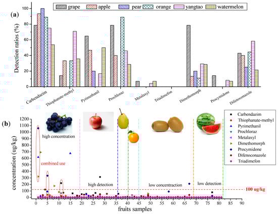 (a) Detection ratios of nine fungicides in 81 fruit samples; (b) detection concentrations of fungicides in 81 fruit samples.