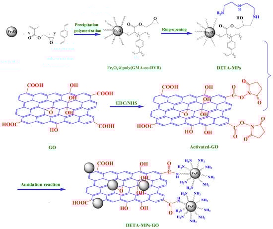 The preparation of DETA-MPs-GO microspheres includes the following four steps, as shown in Scheme 1: (1) Magnetic Fe3O4 preparation: Magnetic Fe3O4 was prepared via a solvothermal approach, with a small modification of the literature []. In this procedure, 3.0 g FeCl3 was weighed into 80 g ethylene glycol (EG), the mixture was vortexed to achieve a yellow solution, and then 3.5 g NaAc and 2.0 g polyethylene glycol were added. Subsequently, the above solution was vigorously stirred for 40 min at room temperature to dissolve the residual solid and then transferred to a 150-mL autoclave, which was then reacted at 200 °C for 6 h. The magnetic Fe3O4 particles were achieved and cleaned using methanol to remove the adsorbed EG. (2) The synthesis of Fe3O4@poly(GMA-co-DVB): Fe3O4@poly(GMA-co-DVB) was prepared as follows: 10 mL GMA and 5 mL DVB were added into 40 mL acetonitrile, then the solution was stirred for 20 min to prepare a preassembly solution. The Fe3O4 microspheres (0.5 g) were then dispersed in 20 mL acetonitrile in a 150-mL round-bottomed flask and dispersed for 0.5 h under sonication. Then the preassembly solution, including GMA and DVB, was sneaked into the Fe3O4 suspension. Then the polymerization was carried out with thxe addition of 0.04 g 2, 2-azobis (2-methyl-propionitrile) (AIBN) under stirring at 600 rpm. The reaction solution was heated to 70 °C and maintained at 70 °C for 3 h. (3) Synthesis of DETA-MPs: the DETA-functional magnetic core-shell polymers (DETA-MPs) were synthesized via a ring-opening reaction between diethylenetriamine (DETA) and epoxide-functional Fe3O4@poly(GMA-co-DVB). In the process, 0.5 g of the achieved Fe3O4@poly(GMA-co-DVB) was firstly added into 100 mL methanol with 10 mL of dissolve DETA, and the mixture was stirred at 80 °C for 8 h. The resulting DETA-MPs was washed three times with methanol and dried in a vacuum oven at room temperature overnight. (4) Preparation of DETA-MPs-GO: DETA-MPs-GO was prepared under ultrasound conditions by an amidation reaction. 100 mg GO power in 50 mL water (2.0 mg/mL) was firstly dispersed under ultrasound for 2 h, and then 160 mg N-hydroxysuccinimide (NHS) and 200 mg N-ethyl-N′-(3-(dimethylamino)propyl)carbodiimide (EDC) were weighed into the above GO dispersion. The achieved dispersion was reacted under stirring for 1 h in order to activate carboxyl groups (-COOH) on the GO sheet. Afterwards, 500 mg DETA-MPs was introduced and dispersed under ultrasound for 20 min. The following reaction was performed at 40 °C for 4 h under vigorous stirring. The final DETA-MPs-GO was obtained after washing with methanol several times and dried for 12 h at 50 °C to remove any residual solvent.