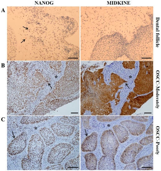 Results of IHC staining of MIDKINE (MK) and NANOG in control and OSCC specimens. (A) In dental follicle tissue from extracted wisdom tooth (control), MK is negatively expressed, whereas some cells show weak expression of NANOG proteins (arrows), which might be related to undifferentiated mesenchymal stem cells in dental follicle tissue; (B,C) in serial sections of high-grade (moderately- and poorly-differentiated) OSCC specimens, MK and NANOG proteins showed highly similar expression patterns, were negatively expressed in interstitial tissue (*) and strongly expressed in cancer cells. NANOG is predominantly expressed in the nuclei of cancer cells but is usually detected in the cytoplasm, indicating high stemness of these cancer cells. MK is mainly expressed in the cytoplasm of cells but it is also highly detected in nuclei, which might be related to the higher proliferation rate and increased survivability of cancer cells. Interestingly, a large proportion of OSCC cells in high-grade tumors showed strong co-detection of MK and NANOG (arrows). Scale bar = 50 µm.