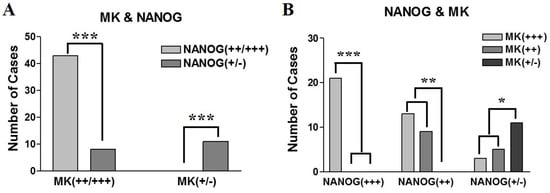 Graphs showing the correlation between IHC expression patterns of MK and NANOG in pretreatment OSCC specimens. (A) The enhanced expression (strong or moderate) of MK is significantly correlated with high expression of NANOG (p < 0.001), whereas weak or negative expression of MK is positively associated with weak expression of NANOG (p < 0.001); (B) similarly, strong or moderate expression of NANOG protein dominantly possess the enhanced MK protein (p < 0.01), and weak expressions of NANOG and MK have a positive relationship (p < 0.05). Data represent the number of cases with positive expression of each protein, and asterisks indicate statistical significances (* p < 0.05; ** p < 0.01; *** p < 0.001).