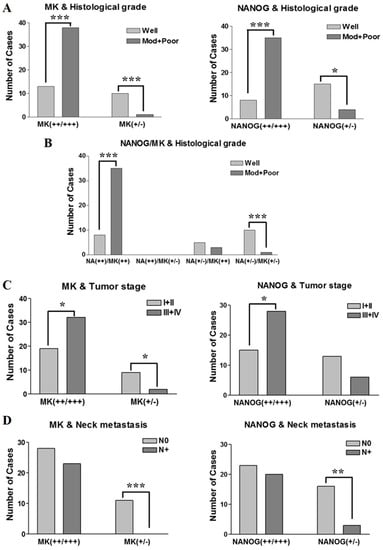 Correlation between IHC expression patterns of MK and NANOG and clinicopathological features of OSCCs. (A) The enhanced expression of MK and NANOG proteins showed strong correlation with high-grade OSCC (p < 0.001), whereas weak or negative expression of the two markers is significantly correlated with a well-differentiated tumor (MK: p < 0.001; NANOG: p < 0.05); (B) in particular, co-enhanced expression of MK and NANOG is significantly correlated with moderately- or poorly-differentiated high-grade OSCC (p < 0.001). Conversely, weak or negative co-expression of MK and NANOG is predominantly detected in well-differentiated tumors (p < 0.001); (C) graphs show the enhanced expression of MK and NANOG is directly associated with late-stage tumors (stage III or IV) (p < 0.05), whereas weak or negative expression of two markers is associated with early-stage tumors (stage I or II) (p < 0.05); (D) graphs show the weak or negative expression of MK or NANOG protein associated with negative neck node metastasis (MK: p < 0.001; NANOG: p < 0.01), although the enhanced expression of two markers has no association with positive neck node metastasis (p > 0.05). Data represent the number of cases with positive expression of each protein, and asterisks indicate statistical significance (* p < 0.05; ** p < 0.01; *** p < 0.001).