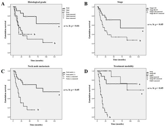 The overall survival rate of OSCCs according to clinicopathological features and treatment modality. (A–D) OSCC patients with well-differentiated tumors (p < 0.01), early-stage tumors (p < 0.05), negative neck node metastasis (p < 0.05), and surgical treatment (Surg and Surg + RT) groups (p < 0.05) showed significant higher overall survival rates than those in the corresponding opposite groups. Different letters denote statistically significant differences between groups (p < 0.05 or p < 0.01).