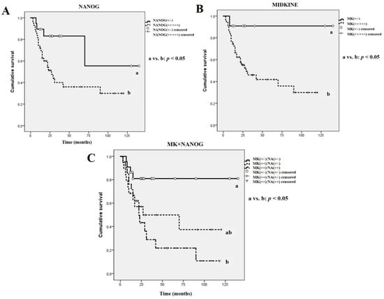 Tissue slices were semi-quantitatively analyzed for antibody binding in cellular components by two pathologists who were blinded to the study information to avoid bias for the present study. Based on a previously reported method [,], positive immunostaining of NANOG and MK was scored with a combination of intensity (where 0, 1, 2 and 3 represent negative, weak, moderate and strong staining, respectively) and the percentage of positively stained tumor cells in high-power fields (0, negative; 1, <25%; 2, 25–50%; 3, 51–75%; and 4, >75%). The sum of the staining intensity and percentage of positive tumor cell scores was graded as follows: +++ (strong, 6–7); ++ (moderate, 4–5); + (weak, 2–3); and − (negative, 0–1). At least three different fields under high magnification (×400) per slide were analyzed for immunostaining intensity. A summary of the IHC staining results can be found in Table 1.