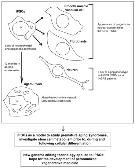 iPSCs from fibroblasts obtained from patients have been developed to model HGPS. Interestingly, HGPS-iPSCs lack the nucleoskeletal and epigenetic alterations normally associated with premature ageing and do not accumulate progerin []. Moreover, upon differentiation of HGPS-iPSCs, progerin and its aging associated phenotype are observed. In fact, differentiating HGPS-iPSCs into smooth muscle cells make the prematurely senescent phenotypes evident [].