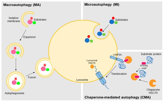 - Kaushik, S.; Cuervo, A.M. Chaperone-mediated autophagy: A unique way to enter the lysosome world. Trends Cell Biol. 2012, 22, 407–417. [Google Scholar] [CrossRef] [PubMed]