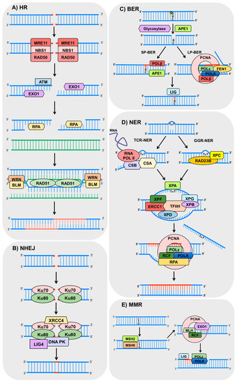BER is the main mechanism for the removal of small base alterations in the DNA structure such as oxidized bases, deamination, alkylation, and abasic (AP) site and single strand breaks [,]. Basically, the initial steps of BER involve base damage recognition and excision by a DNA glycosylase (such as OGG1, 8-oxoguanine DNA glycosylase) and cleavage of the phosphodiester chain at the AP site by an AP-endonuclease, such as APE1 (apurinic/apyrimidinic endonuclease 1). Then, the resulting gap is filled by a DNA polymerase (mostly POLβ, polymerase β), and finally, there is nick sealing by LIG3 and XRCC1 (DNA ligase 3 and X-ray cross complementing 1) [,,]. Other enzymes, such as the PCNA (proliferating cell nuclear antigen), FEN1 (flap endonuclease 1), PARP1 (poly (ADP-ribose) polymerase 1), and LIG1 (ligase 1) also participate in BER [,] (Figure 2C).