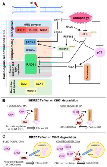 Scheme of the molecular mechanisms known for the autophagy-mediated regulation of double strand break (DSB) repair. (A) Main points of the HR modulation by autophagy. Autophagy degrades proteins KAP1 (KRAB (Kruppel-Associated Box Domain)-Associated Protein 1), heterochromatin protein 1 (HP1α) and p62) involved in negative modulation of BRCA1 (breast cancer 1) and RAD51, activating HR; (B,C) Autophagy controls CHK1 (checkpoint kinase 1) levels through (B) indirect and (C) direct mechanisms; (B) Macroautophagy (MA) down-modulates proteasome-mediated degradation of CHK1. Compromised MA depletes CHK1 levels and decreases HR activity; (C) Chaperone-mediated autophagy (CMA) mediates lysosomal degradation of CHK1. CMA deficiency leads to harmful CHK1 accumulation and HR blockage. IR: ionizing radiation.