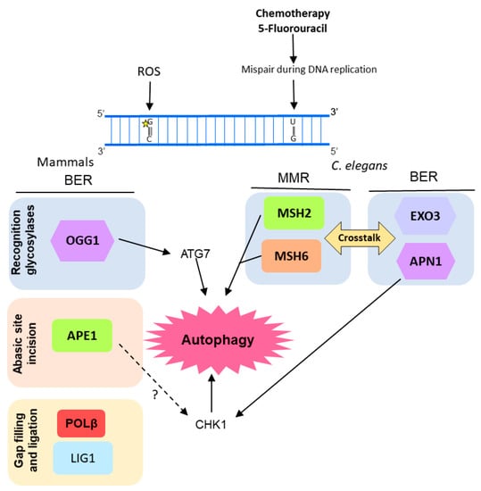 Activation of autophagy was observed after induction of DNA damage by 5-fluorouracil (5-FU, an anti-cancer drug) in Caenorhabditis elegans embryos, as a consequence of the crosstalk between BER and MMR []. MMR proteins MSH2 and MSH6 act as sensors of DNA damage induced by 5-FU. Subsequently, C. elegans BERs AP endonuclease, APN-1, and EXO3, act in the same pathway inducing 5-FU toxicity, activating DDR by the phosphorylation of CHK-1, and leading to cell death by autophagy (Figure 4). Moreover, the human APE1 was also shown to play important role in the autophagy induction promoted by 5-FU in osteosarcoma cells (U2OS) [].