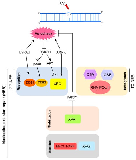 - Yang, Y.; He, S.; Wang, Q.; Li, F.; Kwak, M.J.; Chen, S.; O’Connell, D.; Zhang, T.; Pirooz, S.D.; Jeon, Y.; et al. Autophagic UVRAG promotes UV-induced photolesion repair by activation of the CRL4(DDB2) E3 ligase. Mol. Cell 2016, 62, 507–519. [Google Scholar] [CrossRef] [PubMed]