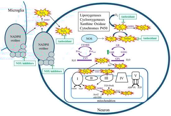 - Halliwell, B. Reactive oxygen species and the central nervous system. J. Neurochem. 1992, 59, 1609–1623. [Google Scholar] [CrossRef] [PubMed]