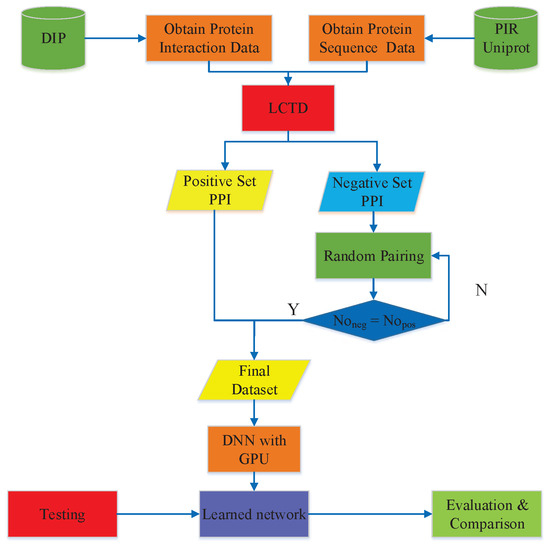 The flowchart of DNN-LCTD for predicting protein-protein interactions. There are some abbreviations in this figure, including database of interacting proteins (DIP), protein information resource, local conjoint triad descriptor (LCTD), protein-protein interactions (PPIs), and graphics processing unit (GPU). The is the number of non-interacting protein pairs, is the number of interacting protein pairs. Y/N means yes/no.