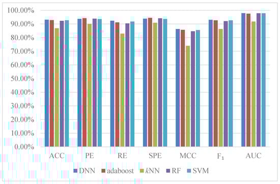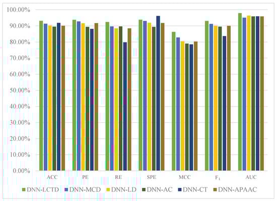 Performance comparison based on DNNs with AC, LD, MCD, LCTD, CT, or APAAC on S. cerevisiae dataset.