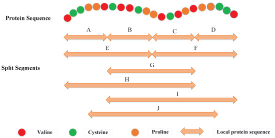 The 10 descriptor regions (A–J) are split for a hypothetical protein sequence. The regions A–D and E–F are obtained by dividing the entire amino acid sequence into four equal regions and two equal regions [20,33], respectively. G stands for the central 50% of the amino acid sequence. Regions H, I, and J represent the first, final and central 75% of the amino acid sequence, respectively.