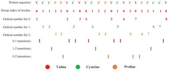 Then, each local region split is replaced by the index depending on the classification of amino acids. For example, protein sequence “VCCPPVCVVCPPVCVPVPPCCV” is replaced by 0112201001220102022110 based on classification of amino acids as shown in Figure 6. There have eight ‘0’, seven ‘1’, and seven ‘2’ in the protein sequence. The composition for these three symbols is 8 × 100%/(8 + 7 + 7) = 36.36%, 7 × 100%/(8 + 7 + 7) = 31.82%, and 6 × 100%/(8 + 7 + 7) = 31.82%, respectively. There are 7 transitions from ‘0’ to ‘1’ or from ‘1’ to ‘0’ in this sequence, and the percentage frequency of these transitions is (7/21) × 100% = 33.33%. Similarly, the transitions from ‘0’ to ‘2’ or ‘2’ to ‘0’ and transitions from ‘1’ to ‘2’ or ‘2’ to ‘1’ are respectively calculated as (3/21) × 100% = 14.29% and (4/21) × 100% = 19.05%. For distribution D, there are 8 residues encoded as ‘0’ in the example of Figure 6, the position of the first residue ‘0’, the second residue ‘0’ (25% × 8 = 2), the fourth residue ‘0’ (50% × 8 = 4), the sixth ‘0’ residue (75% × 8 = 6), and the eight residue ‘0’ (100% × 8 = 8) in the encoded sequence are 1, 6, 9, 15, and 22, respectively. Thus D descriptor for ‘0’ is: (1/22 × 100% = 4.55%), (2/22 × 100% = 9.09%), (4/22 × 100% = 18.18%), (6/22 × 100% = 27.27%) and (8/22 × 100% = 36.36%), respectively. Similarly, the D descriptor for ‘1’ and ‘2’ is (9.09%, 13.64%, 45.45%, 63.64%, 95.45%) and (18.18%, 22.73%, 54.55%, 72.73%, 86.36%), respectively.