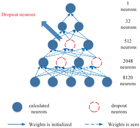 In this work, we use the mini-batch gradient descent [48] and Adam algorithm [49] to reduce the sensitivity to the specific choice of learning rate [27], and speed up training using GPU. The dropout technique is employed to avoid the overfitting, which the activation of some neurons is randomly set to zero during training in each forward pass as shown in Figure 7 [27]. The dotted line means this neuron will not be activated and calculated. The activation function of ReLU [47] and the loss of cross entropy is employed because they can both accelerate the model training and obtain better prediction results [50]. Batch normalization approach is also employed to reduce the dependency of training with the parameter initialization, speed up training and minimize the risk of over-fitting. The following equations are used to calculate the loss: