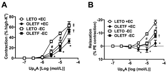 Contribution of the endothelium to cumulative applications of uridine adenosine tetraphosphate (Up4A) in the aortas of LETO and OLETF rats under basal conditions or after being precontracted with phenylephrine (PE). Concentration-response curves for Up4A in endothelium-intact (+EC) and -denuded (−EC) aortas under basal conditions (A) or precontracted with PE (10−6 mol/L). (B) The points show the means ± standard errors as percentages of the contraction normalized by high K+ (80 mmol/L) (A) or as percentages of the relaxation of the contraction induced by PE (10−6 mol/L) (B). n = 5–6. * p < 0.05, +EC LETO vs. +EC OLETF aortas. # p < 0.05, +EC LETO vs. −EC LETO aortas. † p < 0.05, +EC OLETF vs. −EC OLETF. ‡ p < 0.05, −EC LETO vs. −EC OLETF aortas. LETO, Long-Evans Tokushima Otsuka rats; OLETF, Otsuka Long-Evans Tokushima Fatty rats.