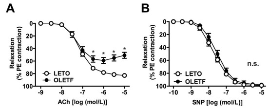 Concentration-response curves for acetylcholine (ACh) (A) or sodium nitroprusside (SNP) (B) in endothelium-intact aortas precontracted with phenylephrine (PE; 10−6 mol/L) isolated from LETO and OLETF rats. (A,B) The points show the means ± standard errors as percentages of the relaxation of the contraction induced by PE (10−6 mol/L). n = 5. * p < 0.05, LETO vs. OLETF. LETO, Long-Evans Tokushima Otsuka rats; OLETF, Otsuka Long-Evans Tokushima Fatty rats; n.s., not significant.