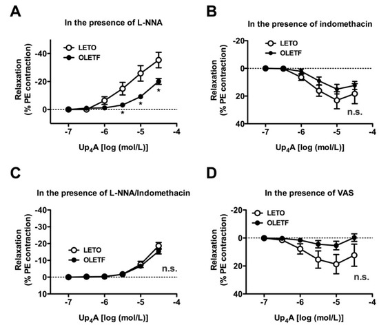 Effects of nitric oxide synthase (NOS) and cyclooxygenase (COX) inhibitors on the cumulative applications of uridine adenosine tetraphosphate (Up4A) in endothelium-intact aortas precontracted with phenylephrine (PE) from LETO and OLETF rats. Concentration-response curves for Up4A in endothelium-intact aortas precontracted with PE (10−6 mol/L) in the presence of a non-selective NOS inhibitor (L-NNA, 10−4 mol/L) (A), COX inhibitor (indomethacin, 10−5 mol/L) (B), L-NNA (10−4 mol/L) plus indomethacin (10−5 mol/L) (C), a selective COX1 inhibitor (VAS, 10−4 mol/L) (D), or a selective COX2 inhibitor (NS398, 10−6 mol/L) (E). The points show the means ± standard errors as percentages of the relaxation of the contraction induced by PE (10−6 mol/L (B,D,E) or 10−7 mol/L (A,C)). n = 6 or 8. * p < 0.05 corresponding LETO group. LETO, Long-Evans Tokushima Otsuka rats; OLETF, Otsuka Long-Evans Tokushima Fatty rats; n.s., not significant; L-NNA, NG-nitro-l-arginine; VAS, valeroyl salicylate.