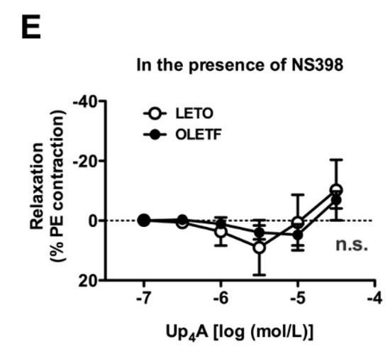 Since (1) NO and COX-derived prostanoids play important roles in regulating vascular tone, (2) abnormalities in their signaling pathways contribute to vascular dysfunction [9,10,11,12,13,14], and (3) nitric oxide synthase (NOS) or COX signaling participates in Up4A-mediated responses in some vessels [20,23,27,28,37], we investigated whether Up4A-induced relaxations were associated with their activities. Under NOS inhibition by NG-nitro-L-arginine (L-NNA), Up4A induced concentration-dependent contractions in endothelium-intact PE-precontracted aortas; this effect was greater in the LETO group than in the OLETF group (Figure 3A). Surprisingly, relaxation responses induced by Up4A in the LETO group were unmasked in the presence of the non-selective COX inhibitor indomethacin (Figure 3B). Under NOS and COX inhibitions, similar contractile responses by Up4A were observed in both the OLETF and LETO groups (Figure 3C). In the LETO group, relaxation responses by Up4A were observed in aortas treated with each selective inhibitor of COX (COX1, Figure 3D; COX2, Figure 3E).