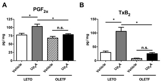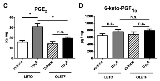 Release of the prostanoids prostaglandin (PG)F2α (A), thromboxane (Tx)B2 (a stable metabolite of TxA2) (B), PGE2 (C), and 6-keto-PGF1α (a stable metabolite of PGI2) (D), evoked by uridine adenosine tetraphosphate (Up4A; 3 × 10−5 mol/L) or vehicle (water) in aortic rings obtained from LETO (n = 7) and OLETF (n = 7) rats. The y-axis shows amounts of prostanoids expressed as pg/mg wet weight of aortic ring. Each column represents means ± standard error. * p < 0.05 vs. Up4A LETO. LETO, Long-Evans Tokushima Otsuka rats; OLETF, Otsuka Long-Evans Tokushima Fatty rats; n.s., not significant.