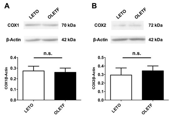 We next investigated whether the expression of COX proteins in the aorta differed between the two groups. An immunoblot analysis of aortas isolated from the LETO and OLETF rats was performed (Figure 5). No significant alterations of COX1 (Figure 5A) or COX2 (Figure 5B) were detected in either group of rats.