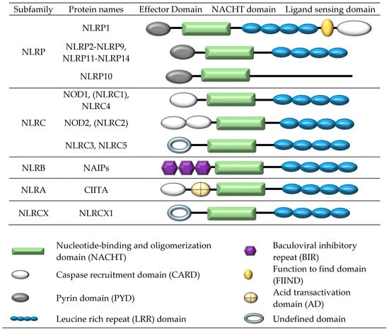 Structure of the human nucleotide-binding oligomerization domain (NOD)-like receptor subgroups.