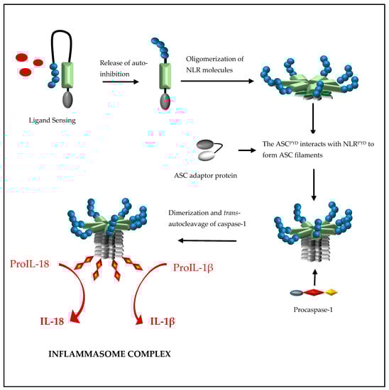 Formation of a NLRP inflammasome is initiated by ligand activation of the receptor protein and this causes the NLR proteins to oligomerize through their nucleotide-binding and oligomerization (NACHT) domains (Figure 2). This oligomerization creates a platform of NLRPYD molecules at the N-terminal and, through NLRPYD/ASCPYD interactions, nucleates helical ASC clusters to form an ASC filament structure. The aggregation of multiple ASCCARD molecules promotes ASCCARD/caspase-1CARD interactions, which, in turn, brings caspase domains into close proximity for dimerization, trans-autocleavage, and activation []. The binding of ASC to both the NLR protein and caspase-1 is facilitated by a 23-residual linker which orientates ASCPYD and ASCCARD back to back, hence preventing steric interference of binding sites while enhancing binding partner prospects []. ASC is sequestered in the nucleus but rapidly translocates to the cytoplasm upon stimulation, where it participates in inflammasome formation []. Interestingly, inflammasome formation can be abolished by preventing the cellular redistribution of ASC [].