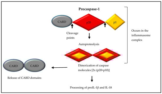 Caspase-1 is synthesized as an inactive, monomeric zymogen (procaspase-1) and, initially, is cleaved into a p35 fragment containing a CARD and p10 fragment. Autoproteolysis results in the generation of a large p20 subunit and a small p10 subunit, as well as the removal of the N-terminal CARD domain. Dimerization of caspase molecules (p20 and p10) results in the catalytically active caspase-1 enzyme (Figure 3) [,]. Inflammasome-activated caspase-1 cleaves its substrates, proIL-1β and proIL-18, at recognition sites adjacent to aspartic acid residues, resulting in mature IL-1β and IL-18 [].