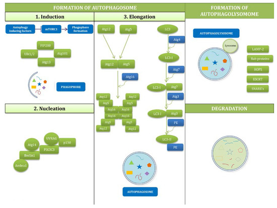 Formation of the autophagosome involves induction, nucleation and elongation. Induction of autophagosome formation has its origins in co-assemblies of ULK1/2, FIP200, and Atg13 and Atg101 creating a so-called ULK1/2 complex. The initiation phase mainly depends on mammalian target of rapamycin (mTOR) kinase, which is a kind of sensor watching over the cell’s condition; however, it can also be induced by diverse input signals such as nutrients, growth factors, Ca2+, ATP, cAMP, hormones, and protein accumulation. Under nutrient-rich conditions, phosphoinositide 3-kinase (PIK3C1) activates mTORC1, which then phosphorylates ULK1 and Atg13 and inhibits autophagy. Under autophagy-inducing cases, such as starvation or hypoxia, mTORC1 is inactivated, and this results in activation of ULK1/2, which phosphorylates Atg13 and FIP200 and regulates proper localization of Atg9 and PIK3C3, both of which are essential in further steps of autophagy. For nucleation, at this stage, the most important factor is the complex of PIK3C3: Beclin1: p150-serine kinase. This complex is located at the phagophore and recruits other Atg proteins. PIK3C3 induces phosphatidyl-inositol-3-phosphate (PI3P) and the activity of this kinase is regulated by Beclin1, which interacts with multiple modulators. Elongation is a step of autophagosome formation that is based on two ubiquitin-like conjugation systems: Atg12-Atg5-Atg16 L (consisting of Atg5, Atg7, Atg10, Atg12, Atg16) and LC3-PE (composed of LC3, 3-phosphatidyl ethanolamine, Atg4, Atg7, Atg3). After formation of the autophagosome, it undergoes a process of maturation, i.e., a fusion with lysosome, thus forming the autophagolysosome [25]. It is a complicated and unclear action which requires several proteins such as LAMP-2, RAB proteins, SNAREs, ESCRT, and HOPS [26]. The fusion with lysosomes leads to the start of degradation of vesicle content by hydrolases and lipases. The final stage of autophagy is the efflux of autophagolysosome content into the cytoplasm. Scheme of these processes is presented in Figure 2.