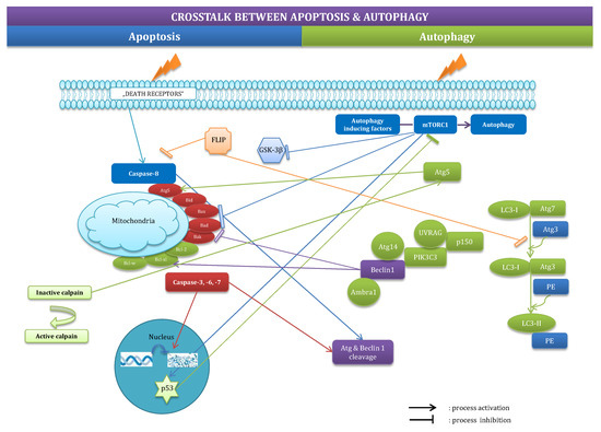 The crosstalk between autophagy and apoptosis has only been partially uncovered. These processes interfere with themselves, mainly with regard to the BCL2 protein family, p53, and Atg5. Autophagy-related Beclin-1 inhibits or stimulates apoptosis, depending on the pro- or anti-apoptotic nature of the members of the BCL2 protein family with which it interacts [27]. Pro-apoptotic p53 initiates or inhibits autophagy depending on the cellular localization of the protein [22]. Atg5 participates in the formation of autophagosomes, translocates to the mitochondria and becomes a pro-apoptotic factor after catalytic incision by calpains [28]. In addition, mTOR, which is an inhibitor of autophagy, also acts on apoptosis-related p53, BAD and BCL2 [29]. Furthermore, caspases mediate cleavage of autophagy-related proteins, including Beclin-1, Atg4D, Atg8, and Atg5 [30]. The latest studies have demonstrated that the anti-apoptotic protein FLIP prevents elongation of autophagosomes by competing with LC3 for binding to Atg3 [31]. However, many questions regarding the interconnecting regulators of apoptosis and autophagy remain unanswered [1]. Crosstalk between apoptosis and autophagy has been outlined in Figure 3.