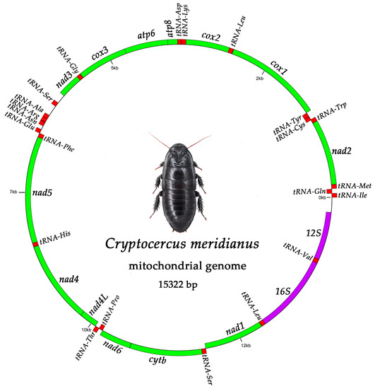 Insect mitochondrial genomes, which tend to evolve faster than nuclear genes, are very useful for studies of evolutionary genomics and are widely used to discern the phylogenetic relationships at various taxonomic levels and the investigation of population structures [10,11]. Jeon & Park (2015) investigated the mitogenome of Cryptocercus kyebangensis and compared it with Cryptocercus relictus [12]. They found that C. kyebangensis has a close relationship with C. relictus and these two Cryptocercus species share the same mitochondrial gene order.