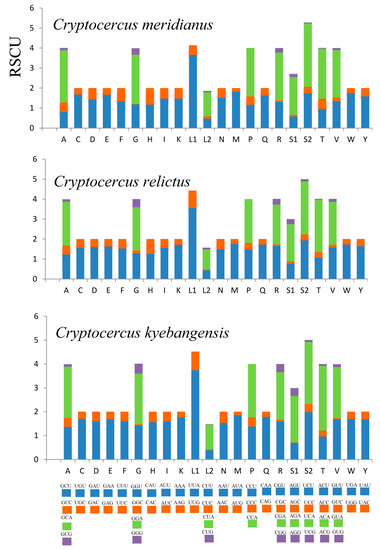 Relative synonymous codon usage (RSCU) was analyzed in the mitochondrial genomes of the three Cryptocercus species (Figure 2). In the mitochondrial protein-coding genes of the three Cryptocercus species, SerUCN (S2) was most commonly used in all three Cryptocercus species. Furthermore, analysis of the RSCU values for the 13 protein-coding genes indicated an A + T bias [19]. As for protein-coding genes, the A + T bias can be responsible for the frequent use of NNA and NNU (N repesents A, T, C, G) codons. The A + T content of C. kyebangensis was slightly higher than in the other two, and the usage of NNA and NNU codons of C. kyebangensis was also higher than in the other two Cryptocercus species.