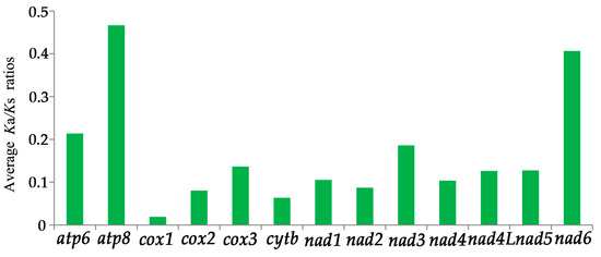 Average Ka/Ks ratios of 13 protein-coding genes. Ka/Ks is the ratio of non-synonymous substitutions rate (Ka) to synonymous substitutions rate (Ks).
