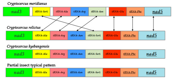 - Boore, J.L.; Lavrov, D.V.; Brown, W.M. Gene translocation links insects and crustaceans. Nature 1998, 392, 667–668. [Google Scholar] [CrossRef] [PubMed]