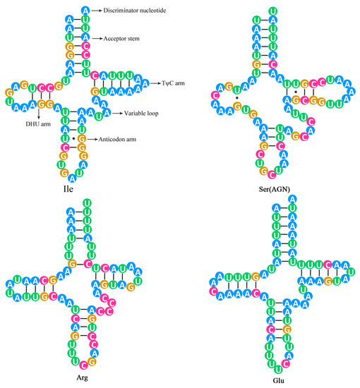 - Lowe, T.M.; Eddy, S.R. tRNAscan-SE: A program for improved detection of transfer RNA genes in genomic sequence. Nucleic Acids Res. 1997, 25, 955–964. [Google Scholar] [CrossRef] [PubMed]