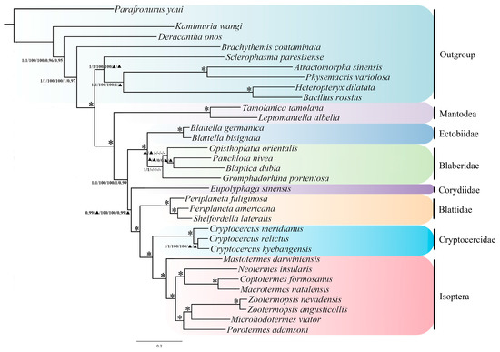 Phylogenetic relationships of major lineages within Blattodea and termites inferred from the concatenated protein-coding genes and ribosomal RNA genes, with the third codon position included (PCGR) and excluded (PCG12R). Branch labels are support for the six analyses in the following order: Bayesian posterior probabilities (BPP) of the Bayesian trees inferred from the dataset PCGR and PCG12R using site-homogeneous models; Bootstrap supports of the maximum-likelihood trees inferred from the dataset PCGR and PCG12R; and Bayesian posterior probabilities (BPP) of the Bayesian trees inferred from the dataset PCGR and PCG12R using site-heterogeneous mixture models. (*) indicates 100% support value for all six analyses. (-) indicates that the node is absent for the corresponding analysis. (▲) indicates BPP below 0.95.