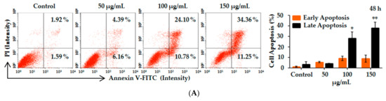 Another hallmark of apoptosis is the externalization of phosphatidylserine on the cell membrane prior to the loss of cell membrane integrity [33,37], which can be monitored by annexin V/propidium iodide (AV/PI) staining [32,38]. HL-60 cells after treatment with various concentrations (0, 50, 100 and 150 µg/mL) of Lp16-PSP for 48 h were analyzed for the induction of apoptosis by using annexin V/propidium iodide (AV/PI) staining. After 48 h treatment, the percentage of apoptotic cells (including early and late apoptotic cells) increased with the concentration of Lp16-PSP from 3.51% to 45.61% (Figure 2A). Statistical analysis showed that the percentage of cells in late apoptosis stage was significantly higher than the control group upon Lp16-PSP (100 and 150 µg/mL) treatment for 48 h. These results suggested that the HL-60 cell death by Lp16-PSP is through the induction of apoptosis.