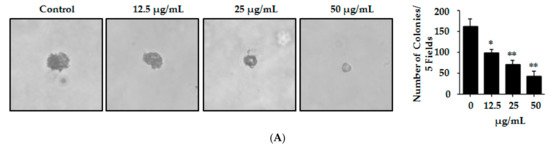 The evaluation of anchorage-independent growth was done by clonogenicity of cells on soft-agar. Lp16-PSP treated (0, 12.5, 25 and 50 µg/mL) HL-60 cells (1 × 103 cells/well) were mixed with 1.2% agar in growth medium, and plated on top of a solidified layer of 0.3% agar in growth medium, in 6 well plates. Cells were fed every 3 days with growth medium, and colony formation was observed daily under a phase-contrast microscope. A number of colonies were counted in five fields under a microscope at 40× magnification [77].
