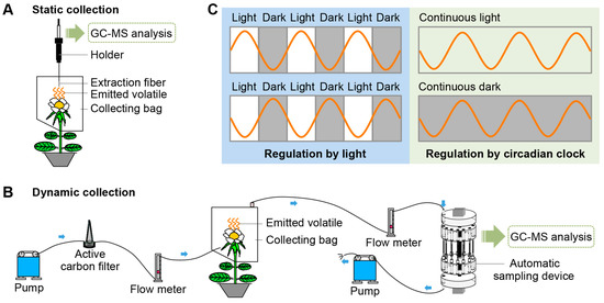 (A,B) Techniques for the collection and detection of volatiles emitted from plants. After collection, emitted volatiles are separated and analyzed by gas chromatography-mass spectrometry (GC-MS). (A) Static collection by solid phase microextraction (SPME); (B) dynamic collection using dynamic automatic sampling system. Airflow is controlled by two pumps and is filtered through an active carbon filter. Blue arrows indicate airflow direction; (C) rhythmic emissions of volatiles under direct light regulation and under control of the endogenous circadian clock.