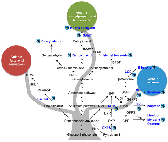 Known factors controlling the circadian rhythmic emission of plant volatiles. Blue text and clock labels indicate that the levels of volatiles emission, intermediate metabolites content, gene transcript, or enzyme activity are under circadian control. Solid arrow is representative of a known route, dotted arrow is representative of an unproven route, and two-way arrow is representative of multiple enzymatic steps. BA2H, benzoic acid-2 hydroxylase; BPBT, benzoyl-CoA:benzylalcohol/2-phenylethanol benzoyltransferase; BSMT, benzoic acid/salicylic acid carboxyl methyltransferase; CCD, carotenoid cleavage dioxygenase; DMAPP, dimethylallyl diphosphate; DXP, 1-deoxy-d-xylulose-5-phosphate; DXPS, 1-deoxy-d-xylulose-5-phosphate synthase; DXR, 1-deoxy-d-xylulose-5-phosphate reductoisomerase; GGPP, geranylgeranyl diphosphate; GGPPS, geranylgeranyl diphosphate synthase; GLVs, green leaf volatiles; GPP, geranyl diphosphate; GPPS, geranyl diphosphate synthase; 13-LOX, 13-lipoxygenase; MEP, methylerythritol phosphate; MVP, mevalonic acid; HPL, hydroperoxide layse; 13-HPOT, 13S-hydroperoxy-(9Z,11E,15Z)-octadecatrienoic; SAMT, salicylic acid carboxyl methyltransferase; IDI, isopentenyl diphosphate isomerase; IPP, isopentenyl diphosphate; ISPS, isoprene synthase; TPS, terpene synthase; PAL, phenylalanine ammonia lyase; PK, pyruvate kinase. The rhythmic emissions of methyl benzoate [36], benzyl alcohol [37], methyl salicylate [37,42], isoprene [38,39], β-ionone [40], mycrene [41], and ocimene [41], β-pinene [43], linalool [44], were under circadian control. The content of benzoic acid [36] and MEP [45] was under rhythmic change. ISPS [39], CCD [40], OH6 [43], SAMT [42], DXPS [45], 13-LOX [46] and were under circadian control.