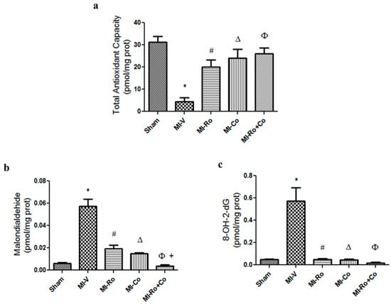 The effect of extracts from Rosmarinus officinalis, Crataegus oxyacantha, and their combination on oxidative stress markers. Total antioxidant capacity (TAC) (a); malondialdehyde (MDA) (b); and 8-hydroxy-2′-deoxyguanosine (8-OH-2dG) (c); The concentrations were evaluated in the ischemic left ventricle areas from rats subjected to sham—or myocardial infarction (MI) and treated seven days with either vehicle (V), Rosmarinus officinalis (Ro), Crataegus oxyacantha (Co) or their combination (Ro+Co). The values show the mean ± SEM from 6 different experiments. p < 0.05 ANOVA one way post Tukey, * Sham vs. MI-V, # MI-V vs. MI-Ro, Δ MI-V vs. MI-Co, Φ MI-V vs. MI-Ro+Co, + MI-Ro vs. MI-Ro+Co.